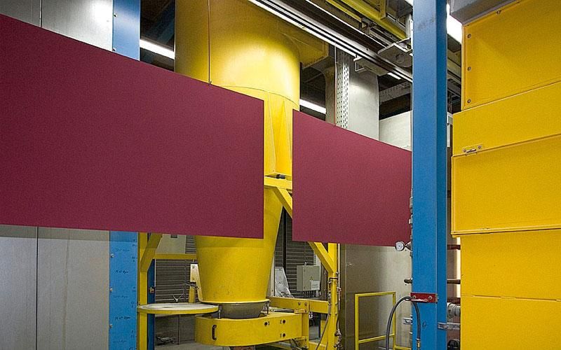 Hier wird das zu beschichtende Werkstück zuerst in der Vorbehandlung gereinigt und mit einer Konversionsschicht versehen. Nach erfolgter Zwischentrocknung wird das Pulver elektrostatisch aufgebracht und anschließend mittels Temperaturen von ca. 190 – 220° C eingebrannt.